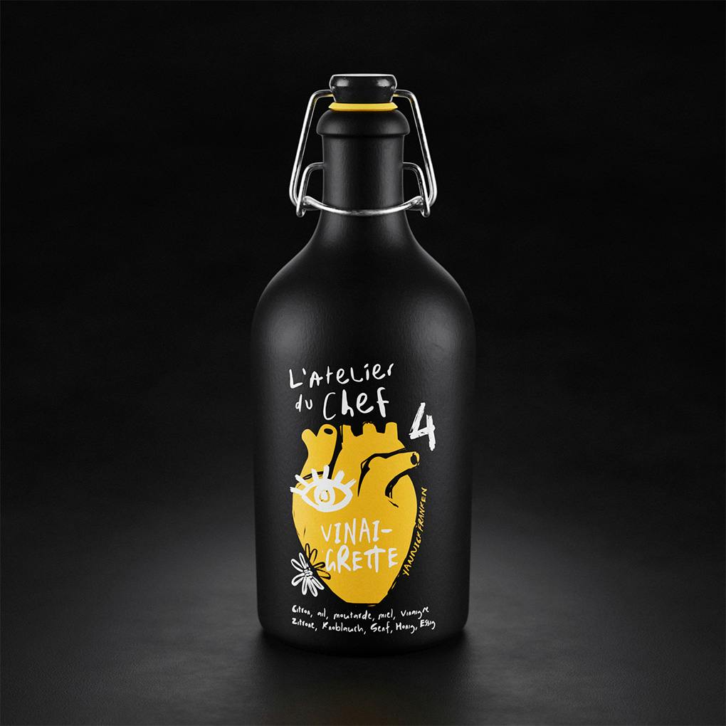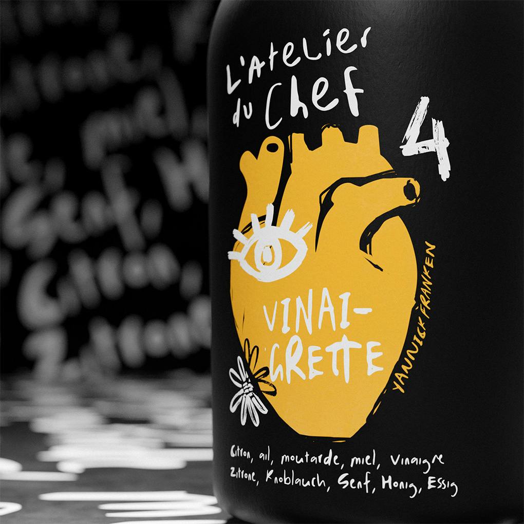 Sowohl unsere Gestaltung als auch das Naming „L’Atélier du Chef“ spiegeln die detailverliebte Natur von Yannick Franken und seiner Vinaigrette wider. Diese wird zukünftig in ausgewählten Geschäften zu kaufen sein, was dem Koch den Schritt von der Gastro in den Einzelhandel ermöglicht.